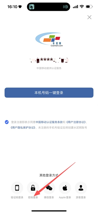 在密码登录页面,输入手机号和密码后点击登录按钮,即可完成水泥网账号的登录操作。