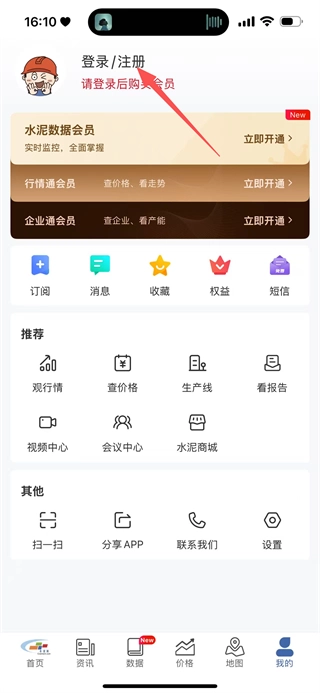 在水泥网首页,点击底部导航栏中的“我的”选项,即可进入个人页面。