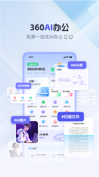360AI办公是一款实用的AI办公工具,具备AI扫描、AI速读、AI创作等丰富的AI办公功能。