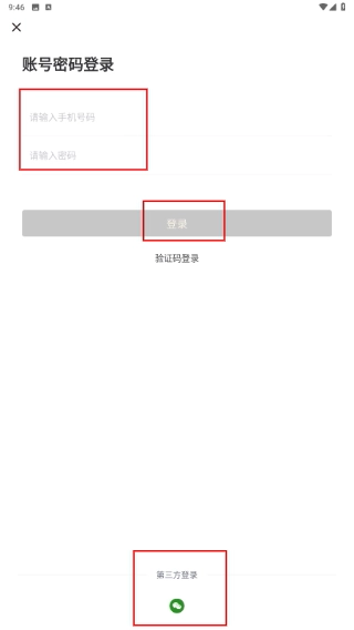 4、切换到账号密码登录方式,填写【请输入手机号码】和【请输入密码】,也可以选择第三方登录来完成操作。