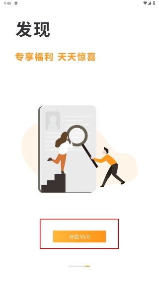 2、进入“发现”页面,找到【开启V2.0】按钮并点击,即可解锁该版本对应的专享福利相关功能。