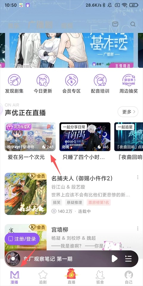 1、打开漫播APP,在首页找到任意一场正在进行的直播并点击进入;