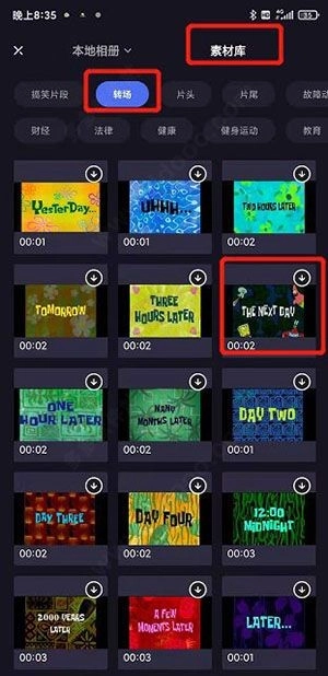 跳转的页面点击素材库 ,点击转场