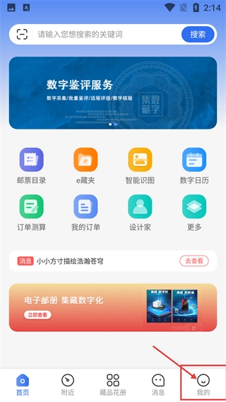 1、在应用首页底部导航栏点击【我的】,即可进入个人中心界面。该应用提供数字鉴评、集藏数字化等服务,同时涵盖邮票目录等功能。