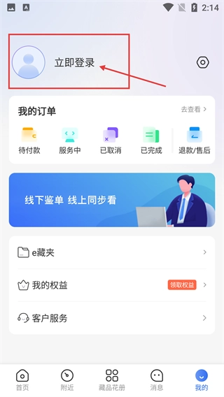 2、在个人中心界面,点击【立即登录】区域,进入账号登录流程,完成登录后可使用个人订单、e藏夹等专属功能。