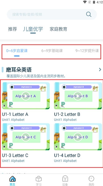 2、点击“儿童优学”板块,即可查看针对不同年龄段孩子开设的启蒙课程。