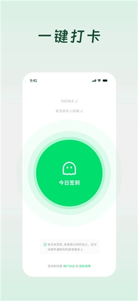 无需注册登录,首次使用只需填写联系人姓名与邮箱即可完成设置,每日打开应用轻轻一点完成签到,后台自动监测状态,不干扰日常习惯,操作轻便易上手