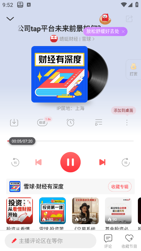 收听时可设置倍速、循环模式,也可点击“收藏节目”或“收藏专辑”,方便后续继续收听。