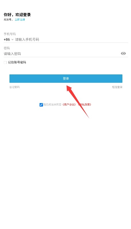 1、输入已注册的手机号码与密码,勾选同意用户协议后点击登录按钮,即可完成身份验证流程。