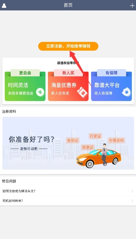 2、打开应用进入首页后,点击“立即注册车主”按钮,上传个人相关资料,完成后就能开始接收订单了。