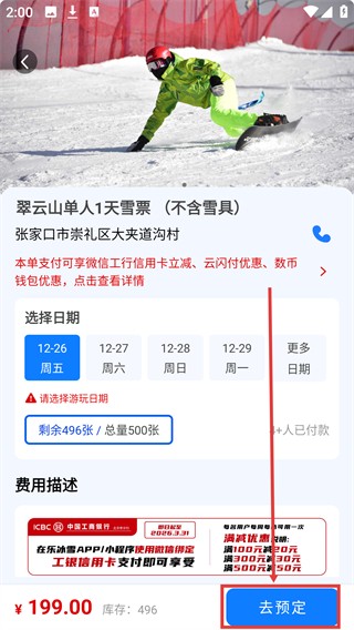 3、在【翠云山银河滑雪场】页面,选择票种,查看其详情信息。