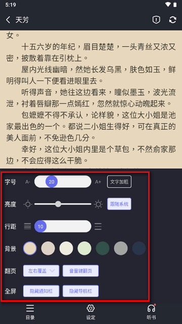 4、点击阅读页面,可以选择目录,设定个性化阅读及听书。