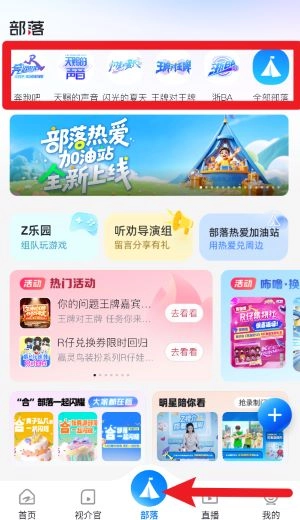 3、点击底部导航栏里的部落按钮,就能进入各类节目专属的社区互动与福利活动专区。