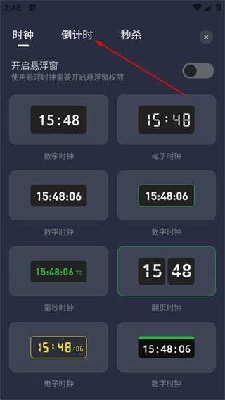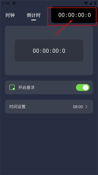 2、进入悬浮时钟页面后,点击倒计时标签,即可切换至倒计时操作界面。