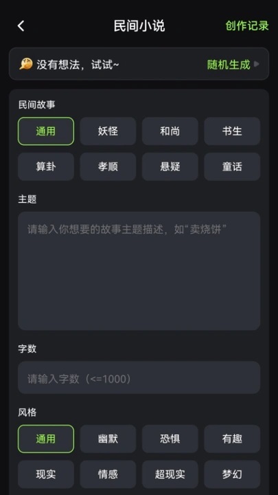 3. 打开后,可直接开启小说创作,还能进行随机生成操作