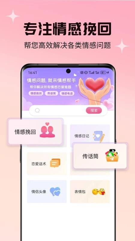 情感帮手是一个专注于解决用户情感困扰的平台,用户在这里能获取情感咨询、聊天技巧指导等服务,无论是恋爱中的矛盾争执,还是家庭关系里的情感问题,都可以通过平台寻求帮助。平台会快速为你对接专业情感专家,专家会结合你的具体情况给出针对性的解决方案,助力你化解各类情感难题,让恋爱和婚姻关系更加和谐顺畅。 此外,情感帮手还精心整理了海量实用的聊天话术资源,你可以在这里系统学习不同场景下的沟通技巧,逐步掌握丰富且实用的话术内容。这些技巧能帮助你更从容地应对各种情感状况,当遭遇情感危机时,也能及时得到合理有效的处理方式。情感帮手,是你贴心的情感好助手,有需要的用户不妨来体验一下!