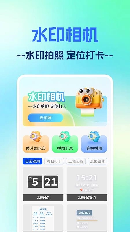 一键打卡水印相机能让用户轻松完成水印相机打卡操作,便于实时进行水印拍照,轻松定位打卡记录,还能自由设置水印信息,简单实现图片添加水印,从而快捷添加多种水印,轻松展示水印图片,实时拼接多张图片,进而轻松完成拼图汇总。
