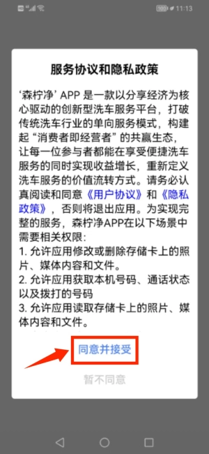 1、打开应用后,在服务协议窗口选择同意并接受,即可进入引导页面。