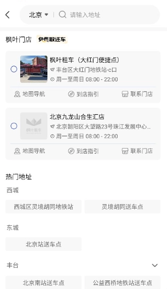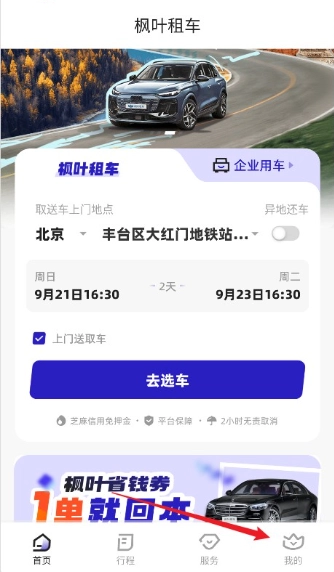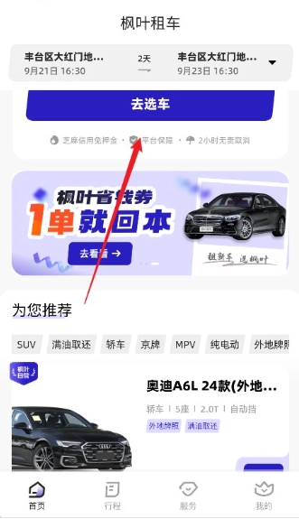 1、打开枫叶租车App,在首页输入所需的取车时间、还车时间与取车地点,填写完毕后确认提交。