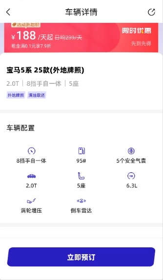 4、选定心仪车辆后,点击页面底部的“预订”按钮,即可完成预订流程。预订成功后,系统会向你发送订单确认通知。