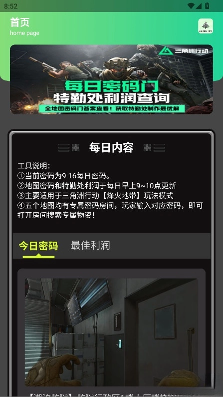 2.地图密码与特勤处利润会在每日早晨9至10点进行更新,该机制主要应用于三角洲行动的【烽火地带】玩法模式。五张地图各自设有专属的密码房间,玩家只需输入对应的密码,就能开启房间并搜寻里面的专属物资!