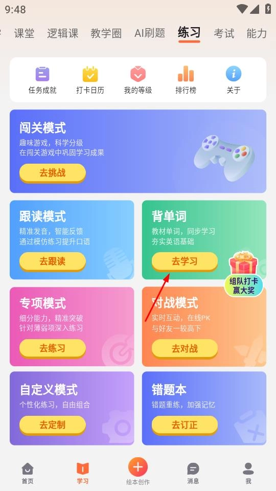 2、在练习页面,点击背单词板块中的去学习按钮。