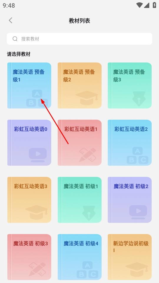 3、从教材列表里挑选你打算学习的教材,像魔法英语预备级1就可以。