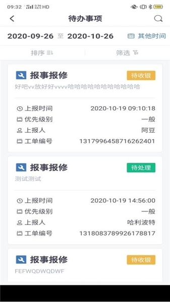 3、点击待办事项,即可查看实时报修的事项列表,也能按照时间筛选事项信息