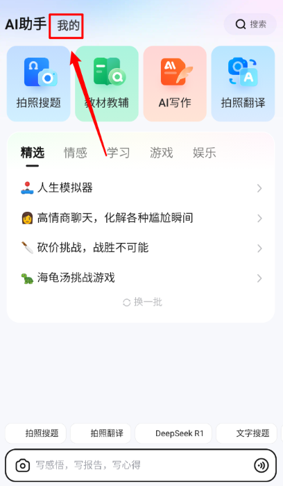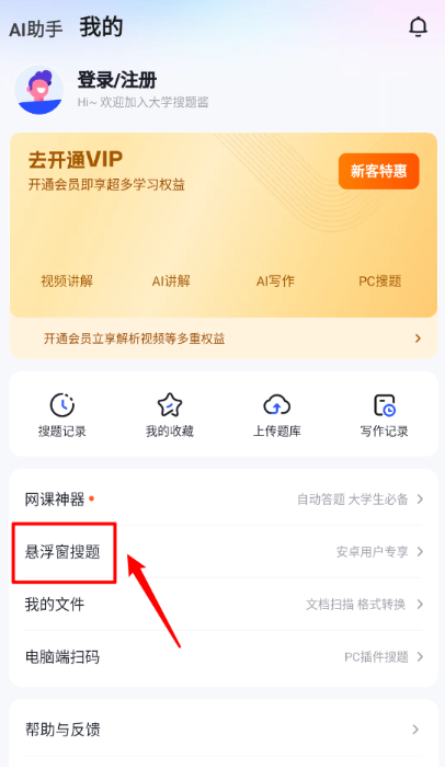 3、然后在我的页面点击"悬浮窗搜题"。