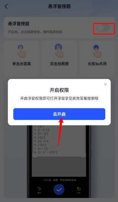 4、接着打开悬浮窗搜题的开关,开启浮窗权限后就能打开浮窗,享受高效的答案搜索服务了。
