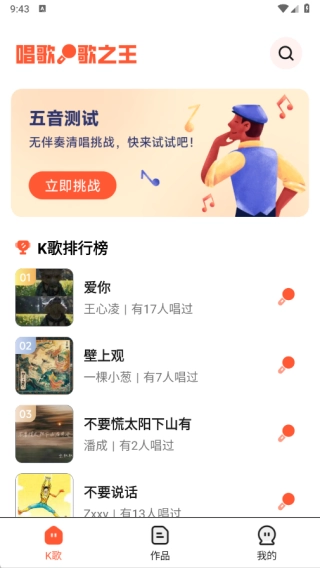 在K歌页面里,既能查看最新的K歌排行榜,也能进行五音测试。