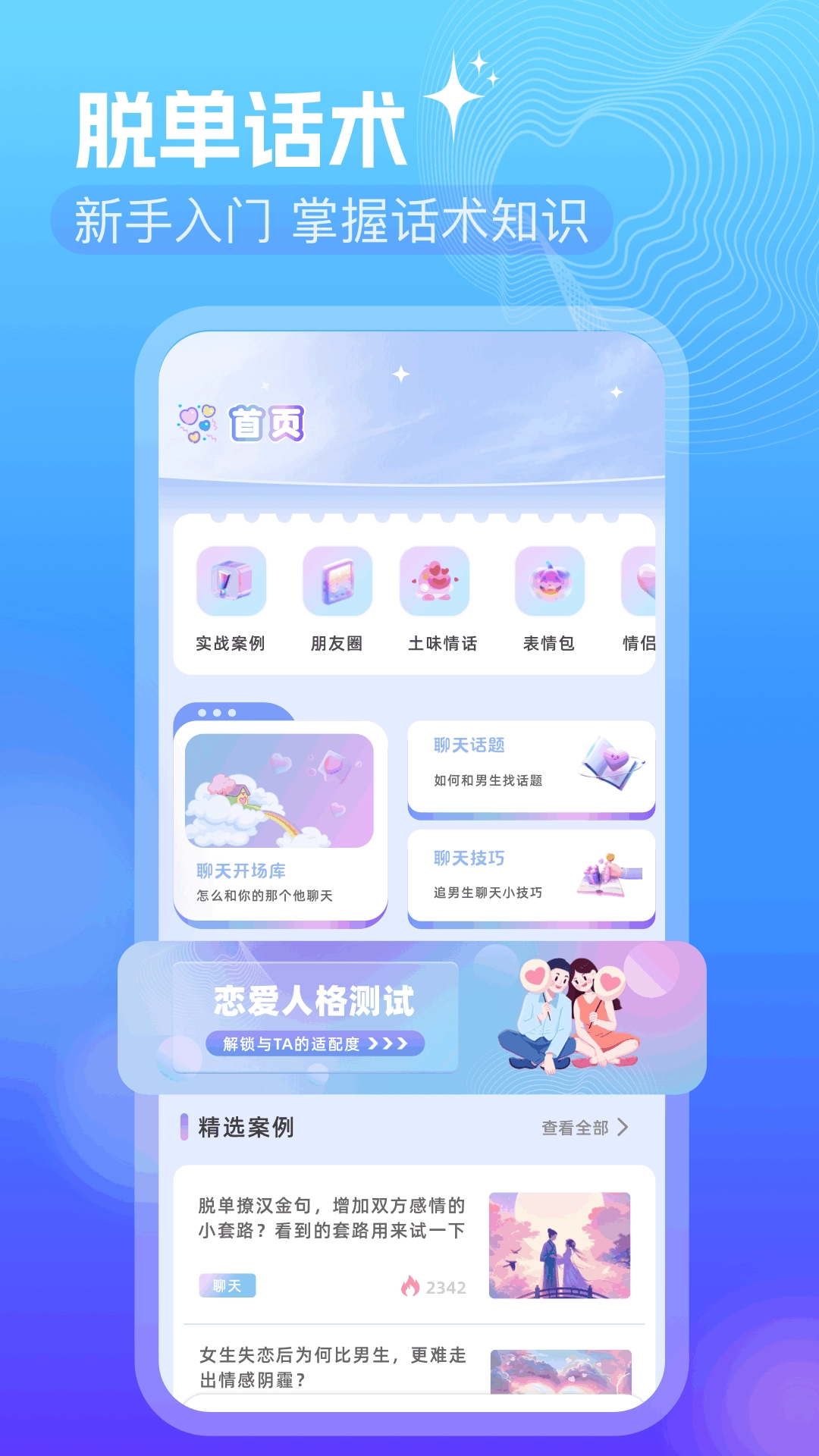 包含聊天话术、沟通技巧、脱单技巧、恋爱话题等,助力在不同社交场景下顺畅交流。