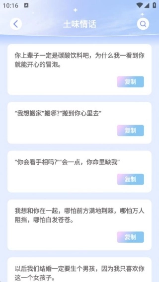 点击土味情话板块,各类情话资源会实时更新,直接复制就能使用。