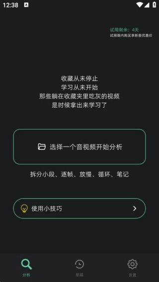 可以选取音视频内容展开分析,把它们分割成若干小段,不仅可以逐帧查看、放慢播放速度、设置循环播放模式,还能随时记录下学习过程中的笔记。