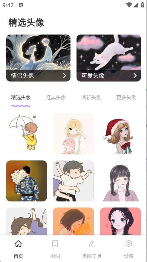 首页页面上展示着各式各样的头像,涵盖了情侣头像、经典头像和清新头像等多种类型。