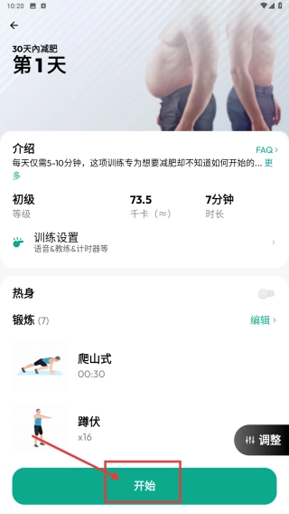 在第1天的训练详情页面,点击下方的“开始”按钮,就能启动训练。