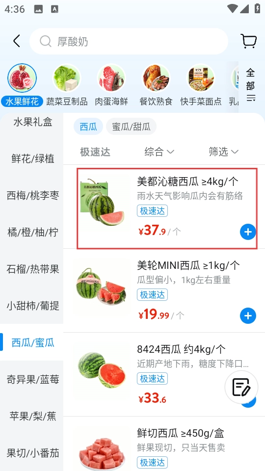 在水果鲜花分类页面,点击左侧的西瓜蜜瓜选项,即可进入西瓜蜜瓜商品列表页。