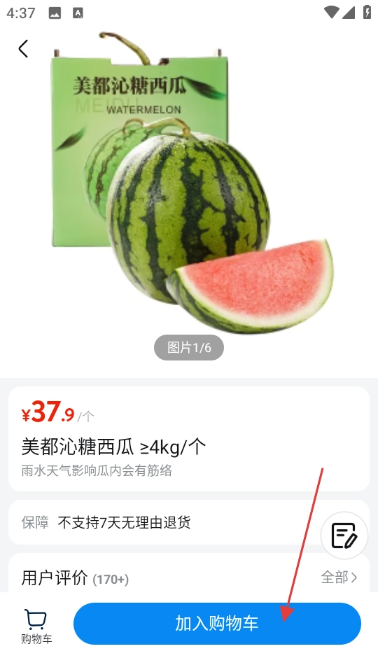 在西瓜蜜瓜的商品列表页面,挑选美都沁糖西瓜这一商品,然后进入该商品的详情页面。