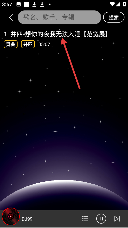 4、在搜索结果里,点击【并四 - 想你的夜我无法入睡【范宽展】】这一条目,随即开始播放此歌曲。