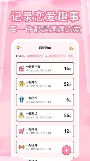 情侣记录恋爱天数这款应用专为情侣用户打造专属二人空间,能记录恋爱日常的点滴瞬间,留存重要事件,支持设置闹钟提醒。所有线上记事仅彼此可见,还可记录花销明细、设定各类纪念日,欢迎有需要的情侣朋友使用!