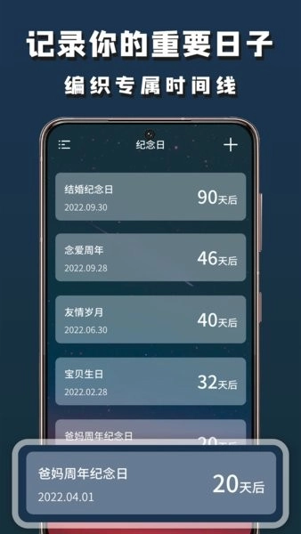 可以记录恋爱天数、结婚纪念日与恋爱纪念日的美好时光,支持正数日记录恋爱纪念、恋爱计时记日子;同时包含生日、节日、纪念日等重要日期的倒数日功能,是恋爱中重要日子的倒计时和计时器小助手。