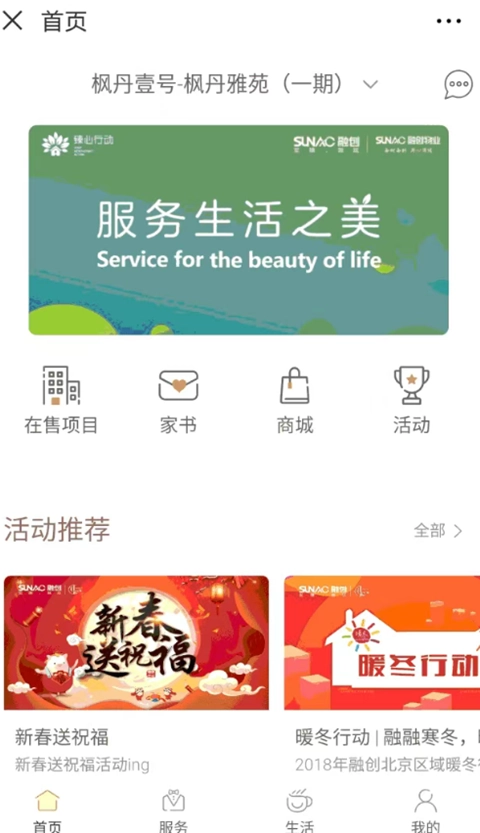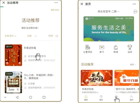 社区活动报名可通过“融创归心”首页【活动推荐】板块进入也可进入【生活】页签点击【活动】板块进行报名。
