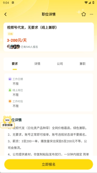 若对兼职岗位感兴趣,可进入详情页面了解更多信息,用户点击“立即报名”按钮即可完成报名操作。