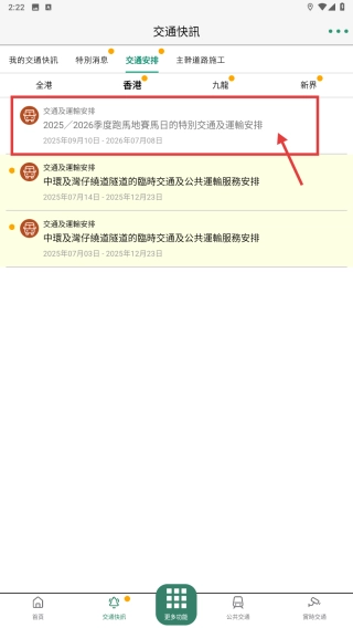 在交通事件分类页面,找到2025/2026季度恩地觅地赛马日的特别交通及运输安排条目,点击进入详情页面。