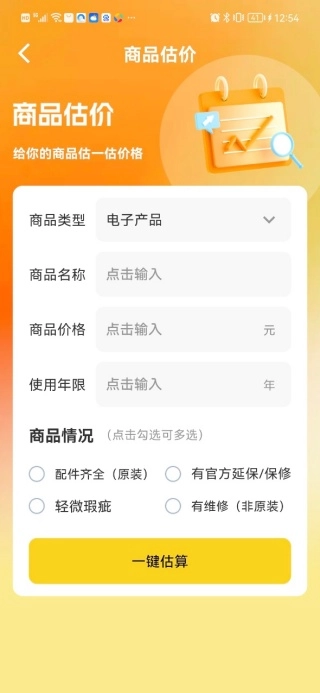 点击商品估价功能,选定商品所属类型,依次填写商品名称、商品价格、使用年限以及商品情况,就能一键快速完成估算。