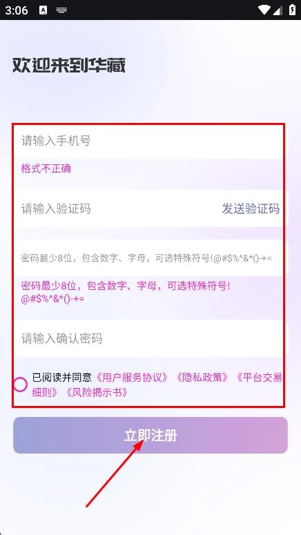 填写手机号码、验证码以及密码等相关信息,随后点击“立即注册”按钮,即可完成注册流程。