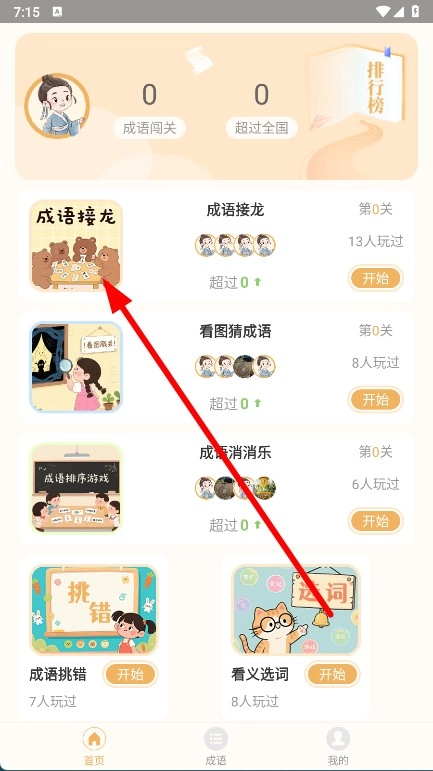 打开,在首页点击成语接龙游戏板块。