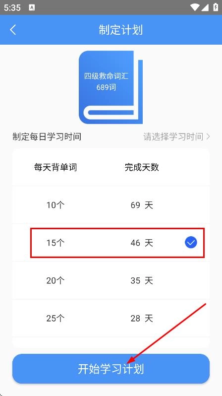 在词汇书选择页面挑选好想要学习的词汇书后,就能进入计划制定页面了。