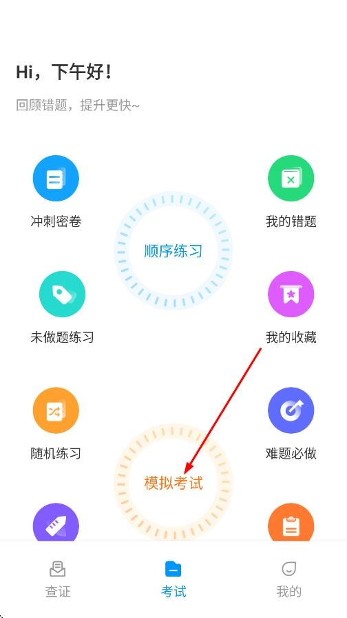 在考试页面,点击模拟考试选项,即可进入模拟考试的准备界面。