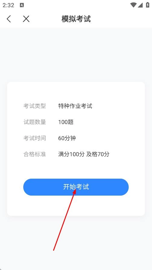 在模拟考试准备页面,点击开始考试按钮,即可启动特种作业模拟考试。